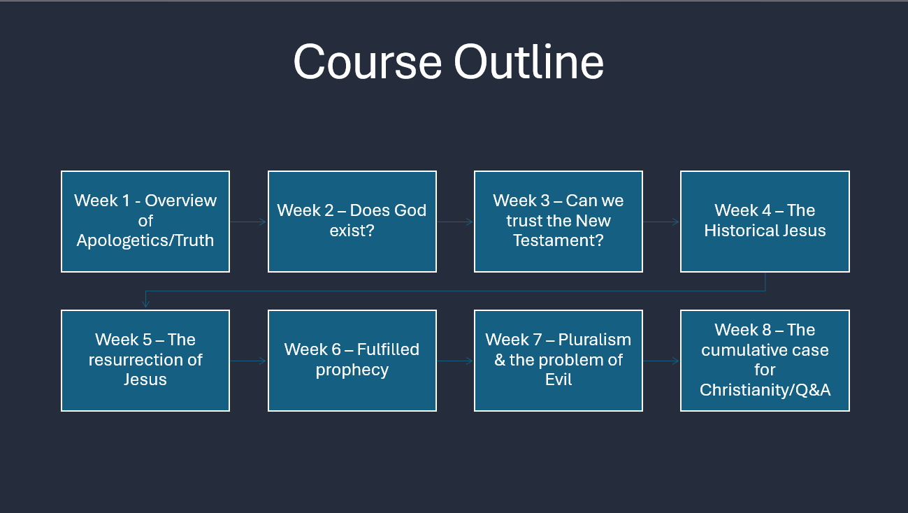 An 8 week course (12hrs total) that systematically walks through the historical evidence for Christianity